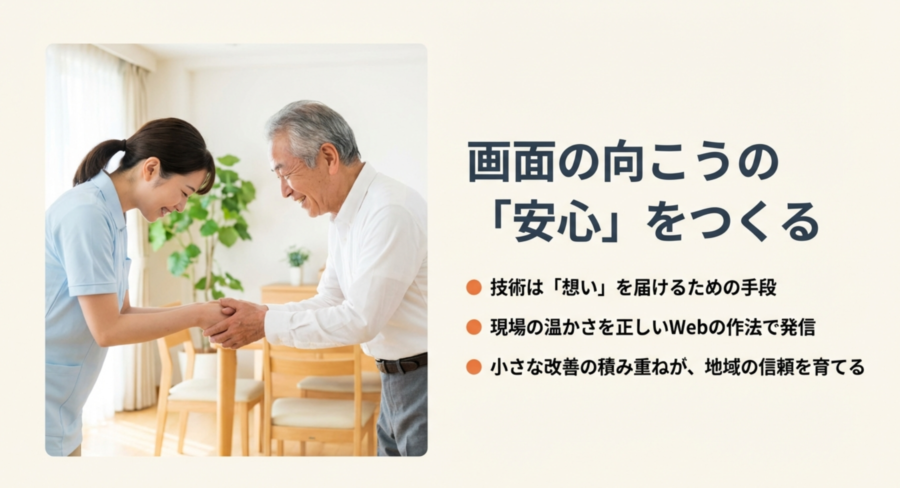 さて、ここまで介護業界の集客に強いホームページの作り方とSEOについて、いろいろな角度からお話ししてきました。結局のところ、一番大切なのは「画面の向こう側にいるご家族の不安を、どうすれば安心に変えられるか」という思いやりなんだな、とつくづく感じます。