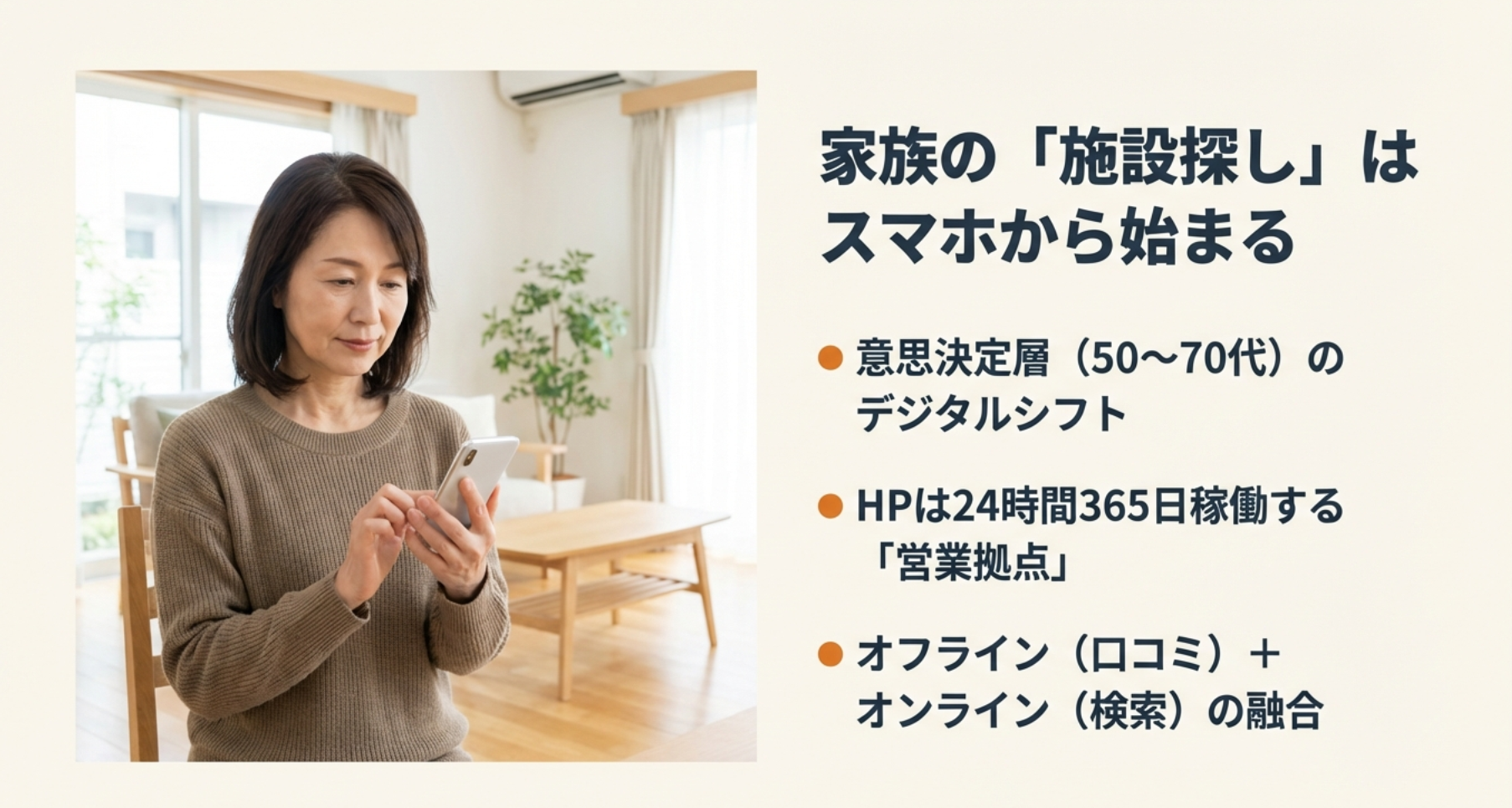 介護業界の集客といえば、これまでは地域のケアマネジャーさんからの紹介や、ご近所さんの口コミといったオフラインのつながりがメインでしたよね。でも、最近はちょっと様子が変わってきています。現在、入居の意思決定をする主要な層である50代から70代の方々は、当たり前のようにスマートフォンを使いこなしています。