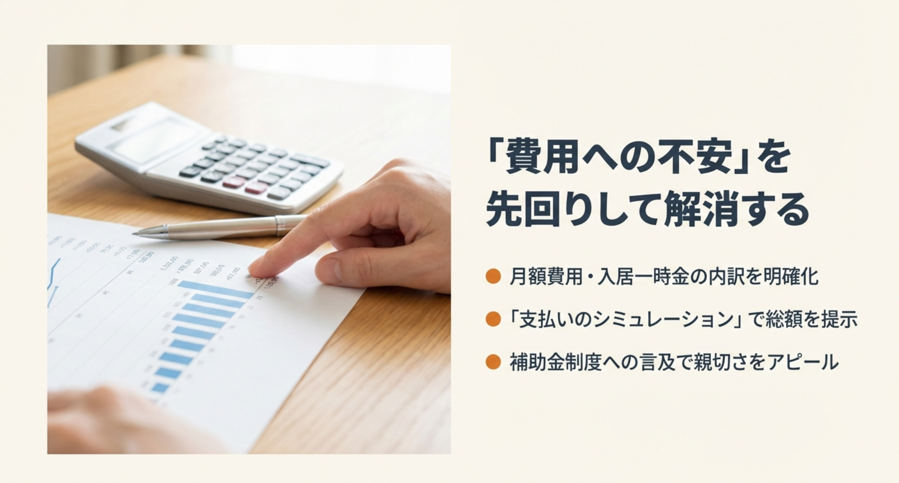 ホームページを訪れる人が最も気にしていることの一つが「お金」のことです。「結局、毎月いくら払えばいいの?」という不安に、どれだけ明快に答えられるかがコンバージョン(問い合わせ)を左右します。「有料老人ホーム 費用 月額」や「グループホーム 料金 安い」といったキーワードで検索するユーザーは非常に多いです。