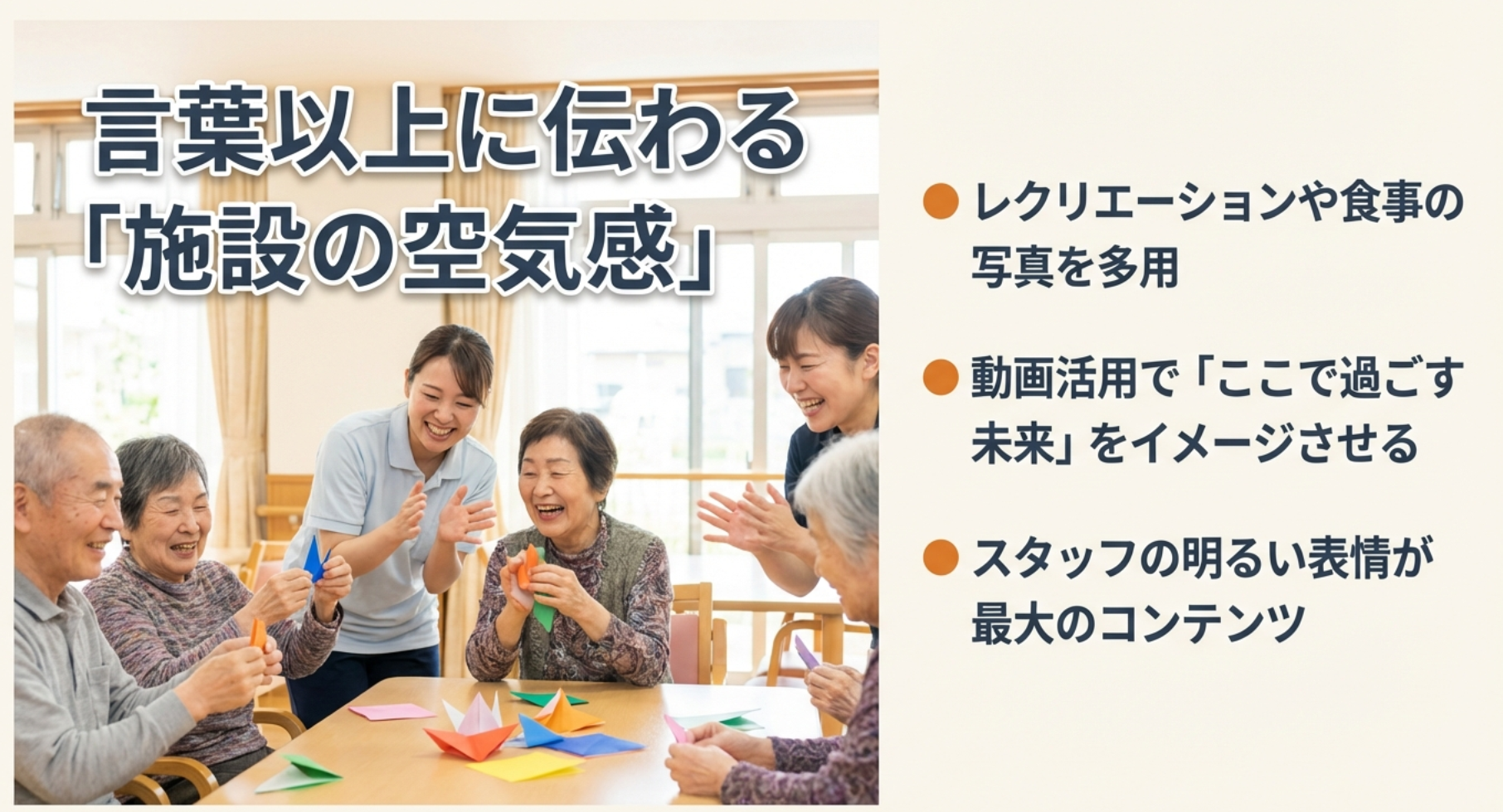 同時に、サービス内容の可視化も欠かせません。文字で「充実したリハビリ」と書くだけでなく、実際のレクリエーションの風景や、美味しそうな食事の写真をふんだんに使いましょう。動画を活用して、施設の空気感やスタッフさんの明るい表情を伝えるのも効果的です。視覚情報は言葉以上に「ここで過ごす未来」をイメージさせてくれますから。