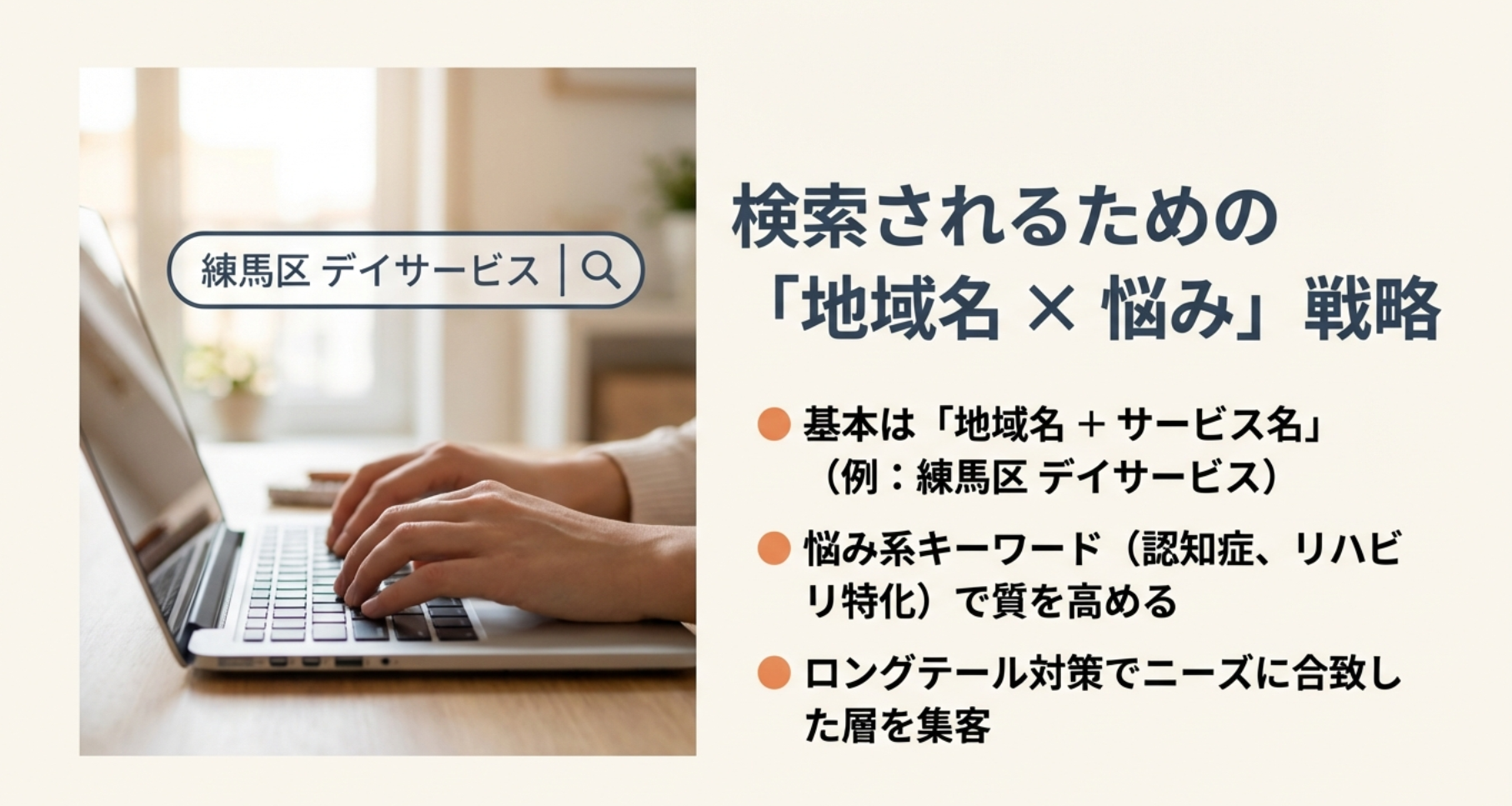介護業界のSEOにおいて、最も重要で、かつ狙い目なのが「地域名 + サービス名」の組み合わせです。例えば「練馬区 デイサービス」や「福岡市 有料老人ホーム」といったキーワードですね。介護サービスは基本的に自宅から通える、あるいは引っ越せる範囲で探されるものですから、エリアを絞った対策が極めて有効になります。