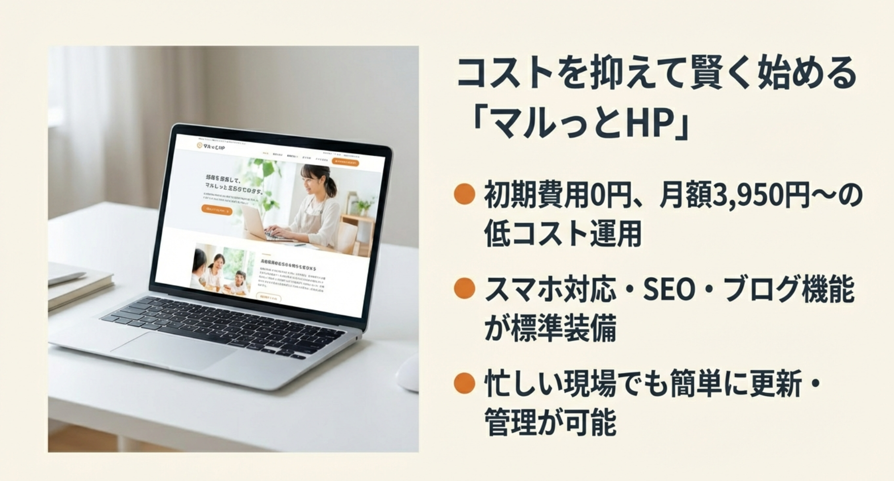 弊社の「マルっとHP」は、まさにそんな介護事業者さんの味方になれるサービスです。初期費用0円、月額3,950円〜という格安な価格設定ながら、今回お話ししたようなスマホ最適化、SSL対応、そして内部SEO対策済みの構成がしっかり備わっています。