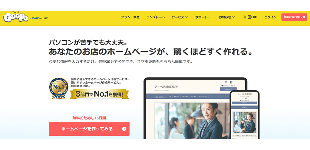 GMOペパボが運営する「グーペ」は、飲食店や美容室、整体院といった「実店舗」を持つオーナーさんにとって、まさに痒い所に手が届くサービスです。汎用的なHP制作ツールとは異なり、店舗運営に必要な機能が最初から「部品」として揃っているのが最大の強みです。