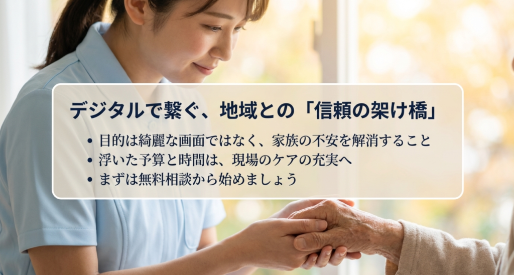 最後になりますが、介護のホームページ制作における究極の目的は、単に綺麗な画面を作ることではなく、「地域の方々との信頼の架け橋を作ること」にあります。不安を抱えて検索しているご家族が、あなたの施設のホームページを見て「ここなら大丈夫だ」とホッとする。その瞬間を作るために、私たちはデジタルの力を借りるのだと思います。