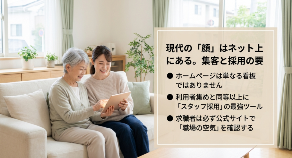 皆さんは、介護施設の運営において、もっとも大切な「顔」がどこにあるか考えたことはありますか。今の時代、それは間違いなくインターネット上のホームページです。しかし、いざ介護のホームページ制作を検討し始めると、星の数ほどある制作会社の中からどこを選べばいいのか、格安の業者でも集客や採用に効果があるのか、疑問や不安が次々と湧いてきますよね。