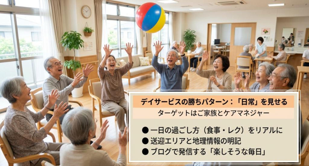 デイサービス(通所介護)の場合、ホームページの主な読者は、ご本人よりもそのご家族やケアマネジャーさんになります。ここで差をつけるポイントは、「一日の過ごし方がリアルに想像できるか」です。食事のメニューやレクリエーションの内容、リハビリの様子などを写真付きで細かく紹介することが、安心感に直結します。