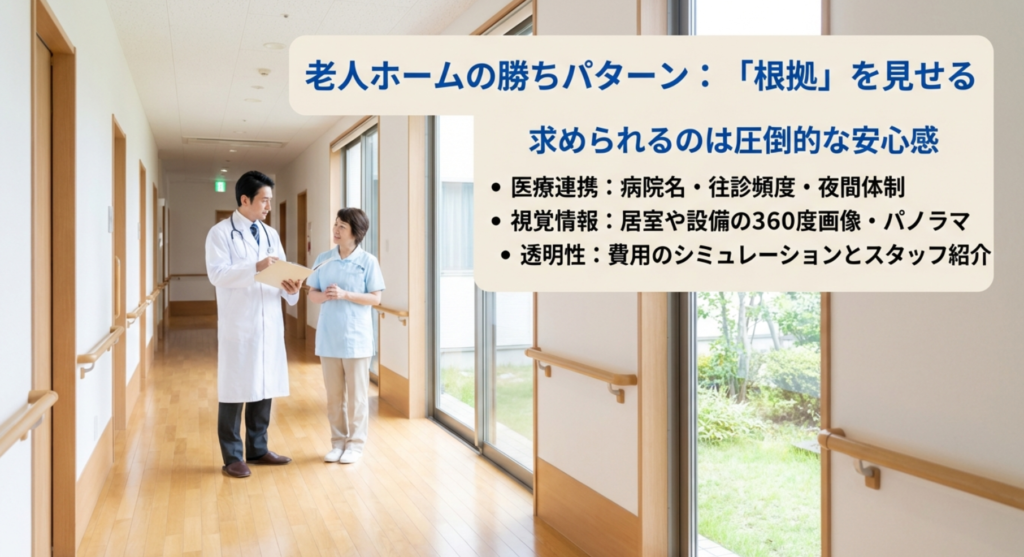 | 医療連携 | 協力病院名、往診頻度、夜間体制 | 重度化への不安に対する信頼 |