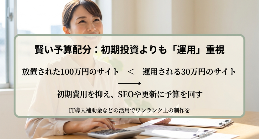 初期制作に100万円かけて放置するよりも、初期を30万円程度に抑え、残りの予算を1年かけて「役立つ記事の作成」や「写真の差し替え」などの運用に充てる方が、検索順位も上がりやすく、結果的に多くの問い合わせを獲得できます。