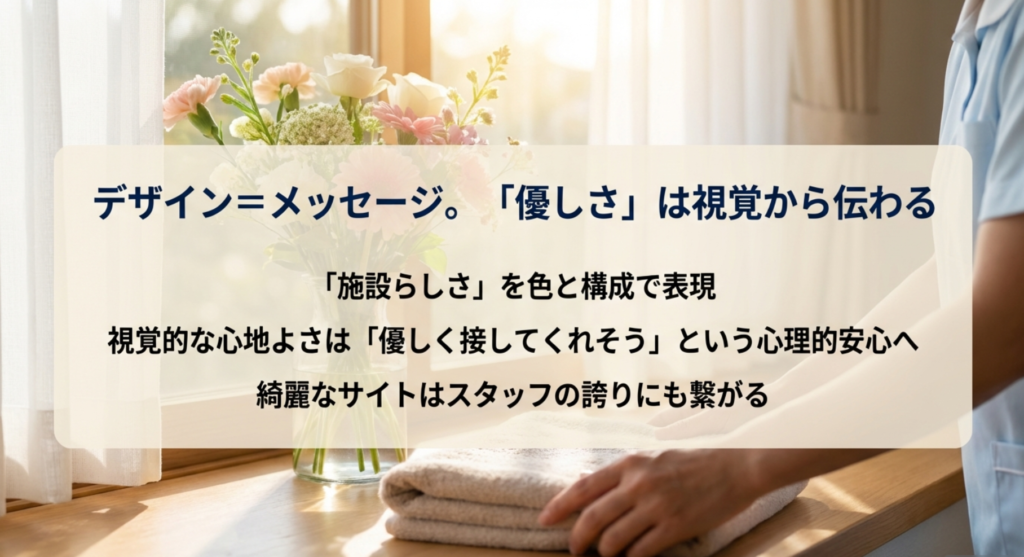 また、デザイン性が高いサイトは「スタッフが誇りを持って働いている」という印象を与え、結果として採用にもプラスに働きます。自分の職場が素敵なホームページで紹介されていたら、スタッフも嬉しいですよね。視覚的な心地よさは、そのまま「ここなら優しく接してくれそう」という心理的な安心感に繋がります。プロのデザイナーが、施設の理念を形にする。そのプロセスこそが、地域の競合施設との決定的な差別化を生むのだと私は思います。