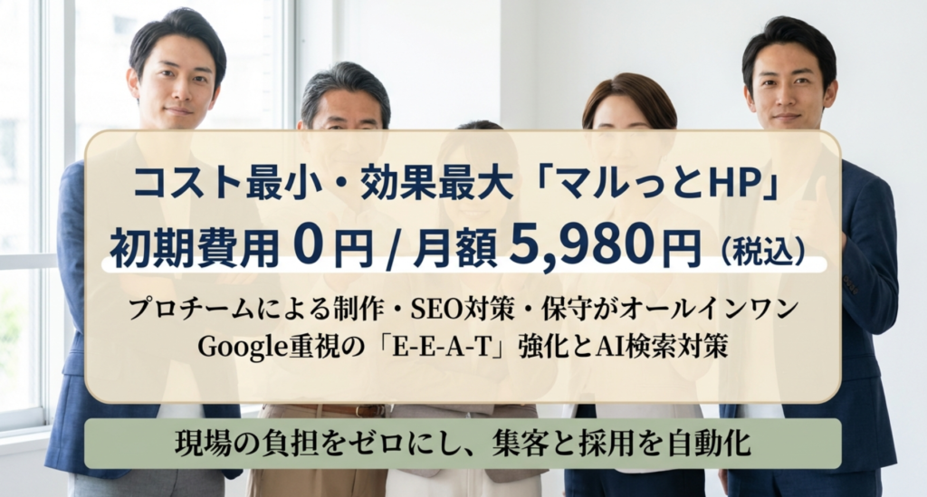 さて、ここまで「選び方」や「運用」の大変さをお伝えしてきましたが、これらをすべて一つのパッケージで解決できるのが、当ブログがおすすめする「マルっとHP」です。私が特に「これは介護施設に合うな」と感じたのは、月額5,980円(税込)という破壊的な安さでありながら、プロの専門チームがサポートしてくれる点です。