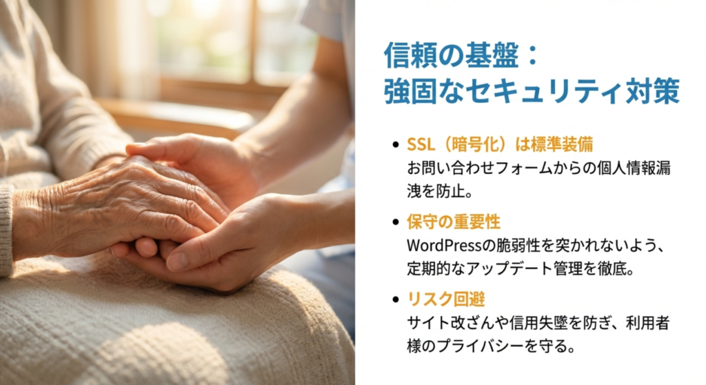 介護施設のサイトには、利用者様やご家族、さらには求職者の個人情報が入力される「お問い合わせフォーム」が欠かせません。ここで一番怖いのが情報の漏えいです。私がエンジニアの端くれとして感じるのは、「SSL(通信の暗号化)」はもはや当たり前で、その先の保守が重要だということです。特に世界的にシェアの高いWordPress(ワードプレス)は、適切にアップデートを繰り返さないと脆弱性を突かれるリスクがあります。