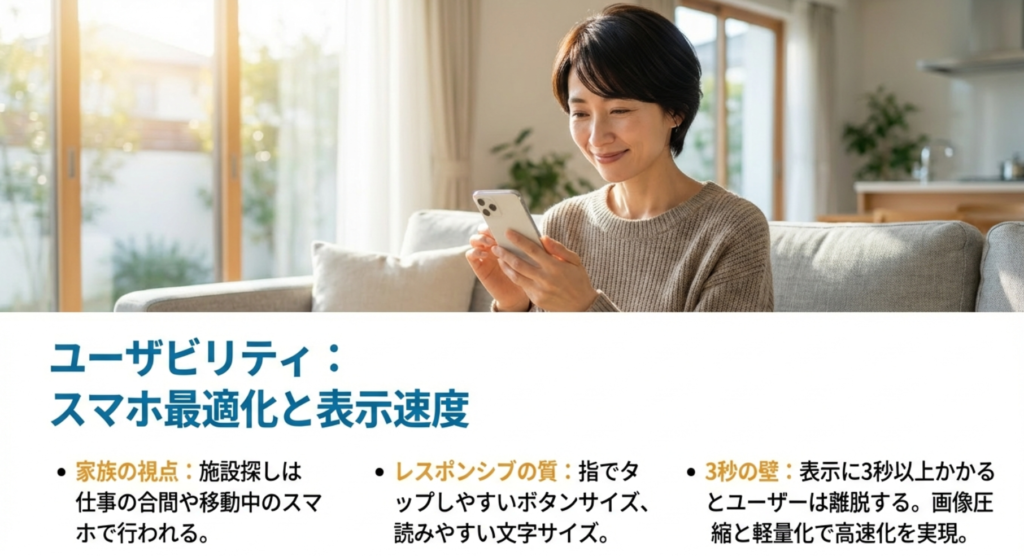 今の時代、ご家族が施設を調べるのは、仕事の合間や移動中のスマホからです。パソコンで綺麗に見えるのは当然として、「スマホでの閲覧性」がサイトの評価を180度変えてしまいます。これをレスポンシブデザインと呼びますが、単にスマホサイズに合わせて要素を縦に並べるだけでは不十分です。例えば、指一本でタップしやすいボタンの大きさ、小さな画面でもパッと読み取れる文字サイズなど、細かい配慮が求められます。