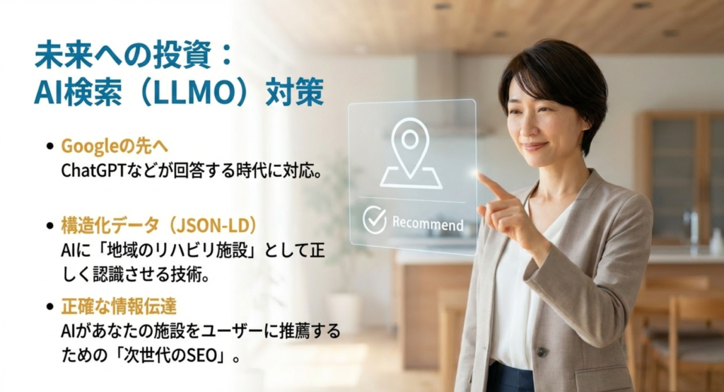 「LLMO(大規模言語モデル最適化)」という言葉を聞いたことがありますか。これは、AIがユーザーの質問に答える際、あなたの施設の情報を正確に参照させるための施策です。例えば、誰かがAIに「近くでリハビリが充実しているデイサービスは?」と聞いたとき、AIがあなたのサイトから正しい情報を抽出して紹介してくれるように準備するのです。これはこれまでのSEO対策の一歩先を行く考え方です。