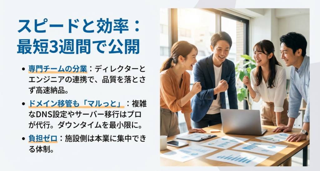 もちろん、短期間で仕上げるからといってデザインが手抜きというわけではありません。プロのディレクターが全体を統括し、エンジニアがコードを組み上げる。この分業体制が確立されているからこそのスピード感なのです。最新の情報については、直接問い合わせてスケジュールの空き状況を確認してみてください。