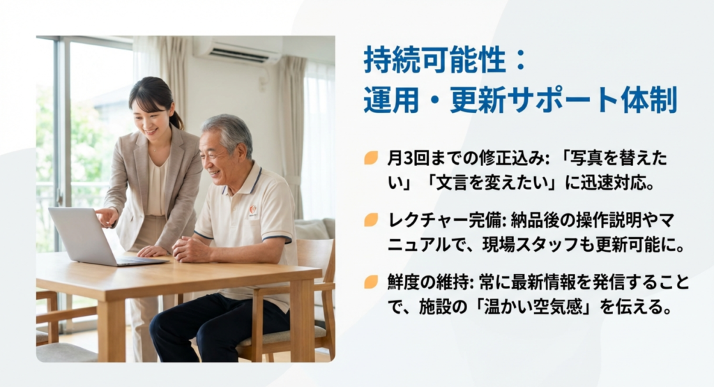 サイトが出来上がって納品された後、「どうやって更新すればいいのか分からない」と放置されてしまうケースをよく耳にします。介護のホームページ制作において、納品後のレクチャー体制は非常に重要です。お知らせの更新やブログの投稿方法など、現場のスタッフさんが迷わず操作できるように、分かりやすいマニュアルや対面(オンライン)での説明があるかどうかで、その後のサイトの「鮮度」が決まります。