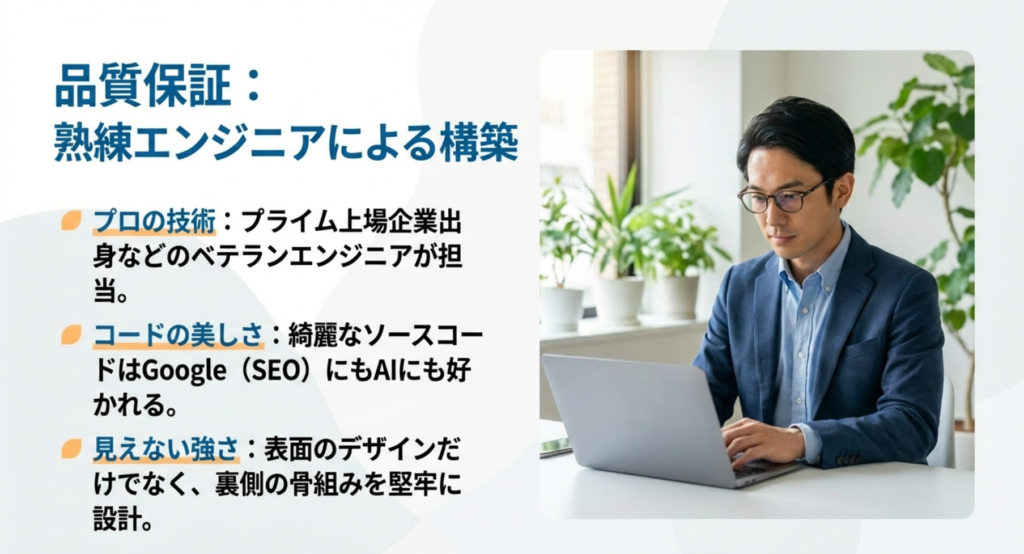 格安のサービスと聞くと、「アルバイトが作っているのでは?」と不安になるかもしれません。しかし、本当に価値のある介護のホームページ制作は、経験豊富なプロフェッショナルが裏側を支えています。プライム上場企業や老舗プロダクションで長年コードを書いてきたような熟練のエンジニアが、サイトの骨組みをしっかり作っているからこそ、動作が安定し、セキュリティも強固になるのです。