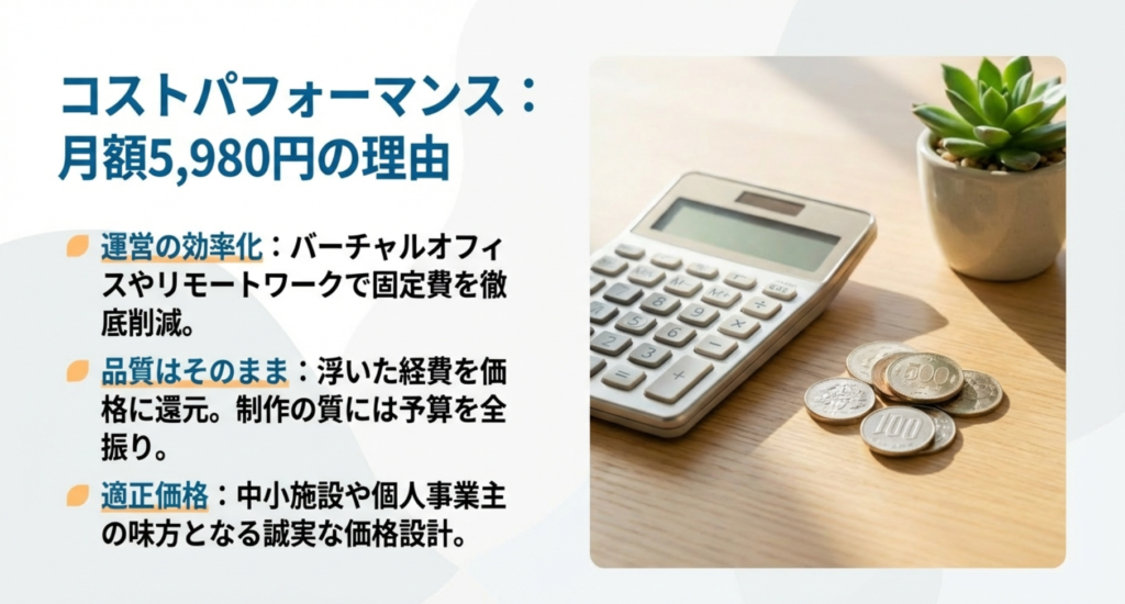 「安いから不安」ではなく、「なぜ安いのか」という理由が明確なサービスは信頼できます。利益を追求するのではなく、理念に共感したメンバーが集まって適正価格でビジネスを支える。そんな誠実な設計こそが、予算の限られた中小施設や個人事業主さんにとって最大の救いになるはずです。