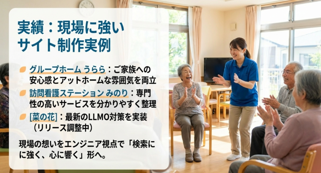 「理屈はわかったけれど、本当に成果が出るの?」と疑問に思われるかもしれません。私は現役エンジニアとして、また介護に携わる人間として、実際に以下のような施設のウェブ戦略をサポートし、現場の想いを形にしています。